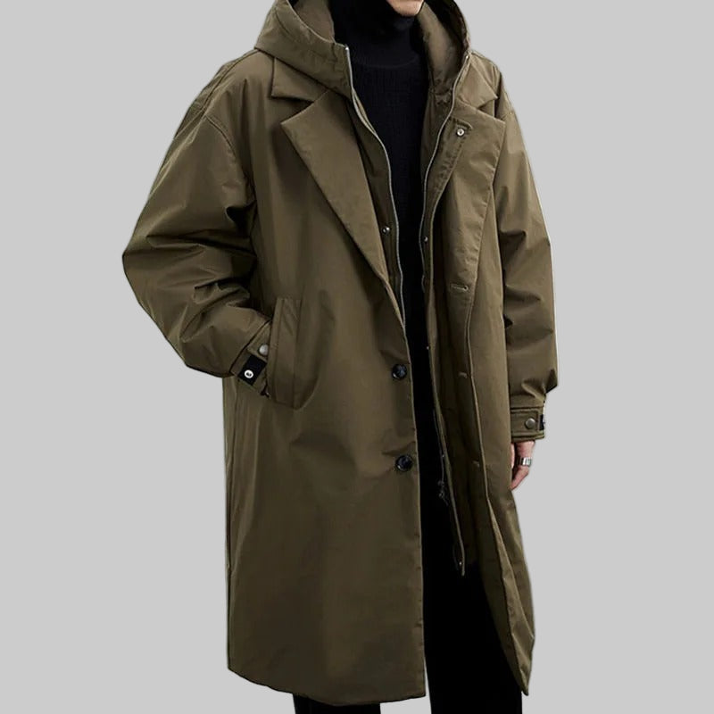 Deze lange puffer trenchcoat voor heren heeft een gewatteerde structuur en een zichtbare capuchon. De lengte valt boven de knie, afhankelijk van de maat. De binnenkant is gevoerd en de buitenlaag heeft een glad oppervlak dat duidelijk zichtbaar is op de foto's.