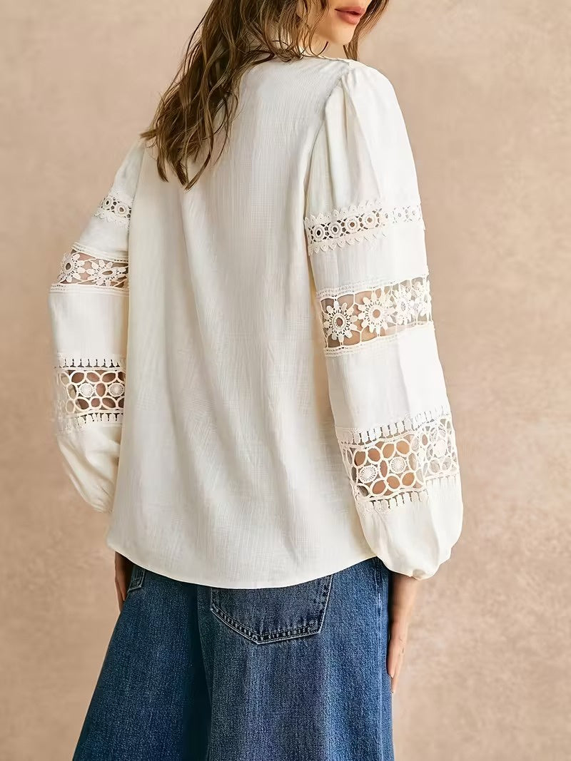 Dit damesoverhemd heeft een kraag en een doorlopende knoopsluiting aan de voorkant. Verticale rijen cirkelvormige opengewerkte en kantmotieven lopen over de voorkant van het kledingstuk. De lange mouwen zijn voorzien van horizontale banen kant en opengewerkte patronen, die eindigen in geplooide manchetten. De kanten details zijn zowel op het lijf als op de mouwen te zien.